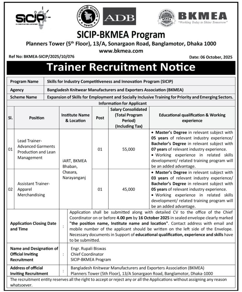 | Recruitment Circular for Training Institute Staff & Trainer under SICIP-BKMEA Program | 13-Oct-2025 |